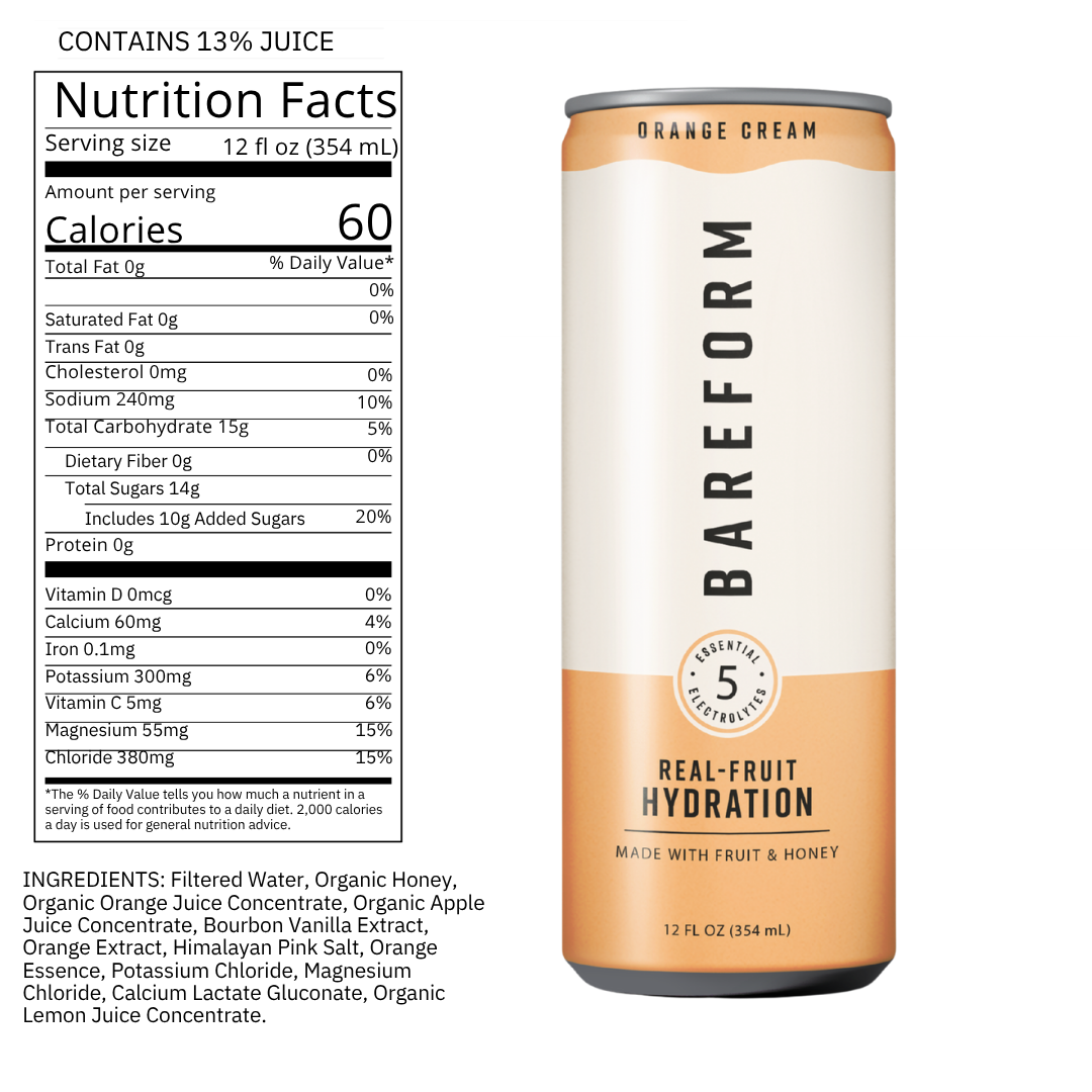 Bareform Orange Cream delivers nostalgia and performance in one refreshing sip. Blending real orange juice, creamy vanilla, and organic honey, this flavor brings smooth, classic taste with clean hydration made only from ingredients you can trust.